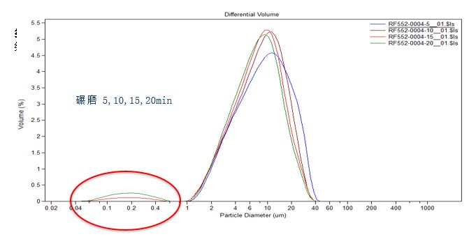 圖5:納米晶藥物,碾磨時間5,10,15,20min,隨著碾磨時間的延長,粒徑逐漸變小,碾磨15min開始出現納米顆粒,且20min納米顆粒成正比例增加。只有高分辨技術才能靈敏檢測。幫助研發質控人員實現工藝研究與控制。