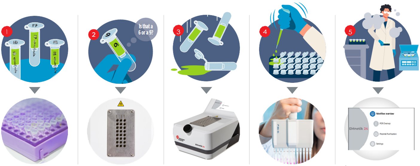 上圖為EMnetik PCR 系統工作流與色譜柱工作流的比較示意圖。上排圖片顯示采用 EMnetik 系統可避免的一些色譜柱常見痛點。1 和 2:無需擔心樣品編號弄臟而無法識別,也無需擔心數字 6 和 9 的混淆。在 EMnetik 系統中,樣品可以適用于 24 孔格式或用于 PCR、酶促反應等格式,并以恰當的方式記錄樣品名稱,無需用墨水寫在容易弄臟的色譜柱上。3:將樣品從熱循環器直接轉移至 EMnetik。無需再次搬動,不慎墜落的概率減小。 4:采用多通道移液器代替單通道移液器,輕松快速移液至 24 份樣品。5:無需在工作臺和離心機之間來回走動,EMnetik 24 配備用戶友好界面,助您完成余下的全部工作。