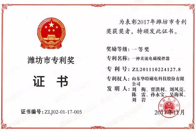 山東華特磁電科技股份有限公司發(fā)明專利“一種直流電磁攪拌器”榮獲2017年度濰坊市專利獎一等獎,這是公司貫徹執(zhí)行國家知識產(chǎn)權(quán)戰(zhàn)略,將知識產(chǎn)權(quán)作為科技創(chuàng)新重要內(nèi)容,強(qiáng)化成果轉(zhuǎn)化,提升經(jīng)濟(jì)效益的又一重大體現(xiàn)。