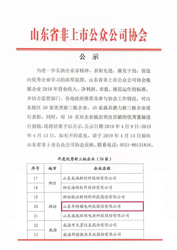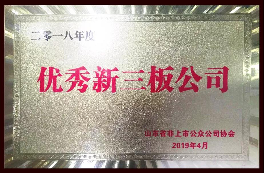 本次會議根據企業2018年度營業收入、凈利潤、市值、規范運作的標準,并結合監管部門、各地政府推薦及參與協會工作情況,對山東轄區30家優秀新三板企業,10家最具潛力新三板企業進行了表彰。華特公司在全省五百多家新三板企業中脫穎而出,榮獲“2018年度優秀新三板公司”稱號。