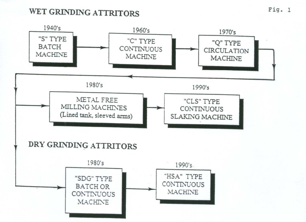 1946 年,Szegvari博士創(chuàng)立了自己的攪拌磨制造公司Union Process Inc.經(jīng)過近50年(至今已75年)的持續(xù)研發(fā),超細攪拌磨已成為最高效、用途最廣的研磨和分散設備之一。圖一顯示了攪拌磨多年來發(fā)展的概況。