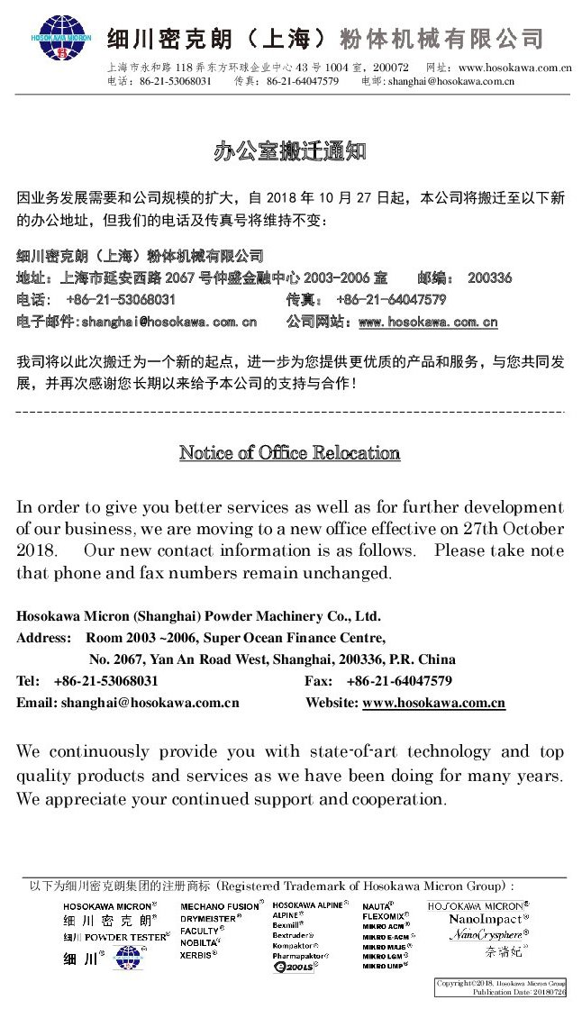 因業務發展需要和公司規模的擴大,自2018年10月27日起,本公司將搬遷至以下新的辦公地址,但我們的電話及傳真號將維持不變: