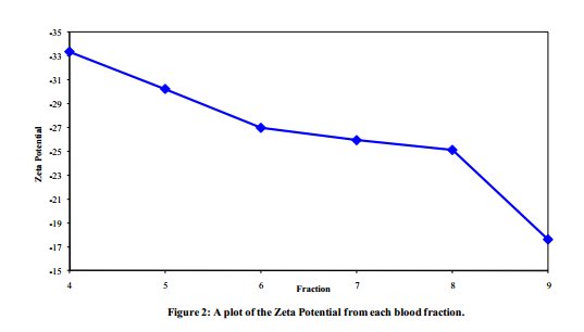 Zeta 電位已用于測量膠體分散的穩定性。其基礎是,Zeta電位與粒子表面的電荷成正比。Zeta電位越大,這些粒子之間的排斥力就越強。如此巨大的排斥力不斷將粒子從隨機碰撞一起擴散,形成聚合。Zeta 電位測量可用于其他應用。在這篇論文中,Zeta電位用于測試一種將血液分離成各種分數的儀器。紅血球的表面電位比白血球大。觀察到,隨著白血球濃度在每個分數的增加,平均Zeta電位降低。