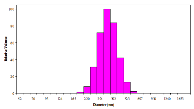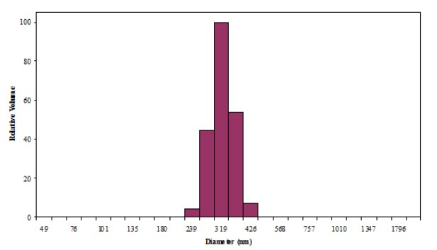圖一顯示了使用一定量的乳化劑生產(chǎn)的稀乳液(醋酸乙烯酯)的DLS得到的體積加權(quán)粒徑分布。這個簡單的2參數(shù)PSD由原始強(qiáng)度加權(quán)結(jié)果計算得到,通過累積量分析得到。體積加權(quán)平均直徑為323.6nm,標(biāo)準(zhǔn)差為36.9nm(占平均直徑的11.4%)低卡方值0.287表明高斯分布的結(jié)果是可靠的。