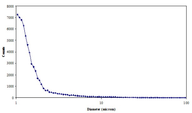 圖4顯示了不適用乳化劑生產(chǎn)的乳狀液(同樣1ml乳狀液加入到100ml的水中)的粒徑分布。在這種情況下,發(fā)現(xiàn)大于1μm的粒子數(shù)為90075,幾乎是另一個樣本整個乳膠注入量(圖2)的2倍,尾部顆粒占了注入乳膠總量的0.634%。由于粒徑分布的尾部延伸到了更大的直徑,因此這個占比要比另一個樣本大得多。事實上,它的形狀與此(圖2)明顯不同.