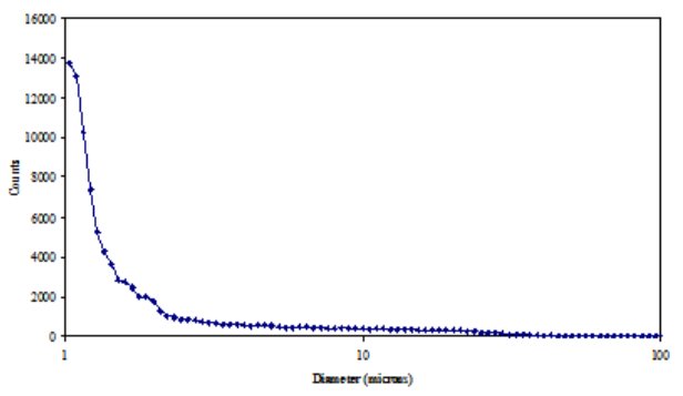 圖2顯示了使用帶LE型傳感器(AccuSier780,PSS)的SPOS技術(shù)對同一乳液(1ml注入100ml水)獲得的粒徑分布,這顯示了乳膠滴分布的尾部,它定義了粒徑分布的上限邊緣。結(jié)果表明,注入本儀器自動稀釋系統(tǒng)的乳膠液總量為58226個粒子,其中大于1μm的乳膠液總量為0.024%,圖2中的衰減圖標(biāo)識實際的粒子數(shù),它看起來是平滑的,因為每個通道中計數(shù)的粒子數(shù)量與統(tǒng)計波動相比很大。