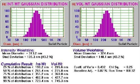 圖5:通過DLS(NICOMP 380)獲得的“優(yōu)質(zhì)”氧化鈰漿料(#1)的近似PSD –簡(jiǎn)單的“高斯”(2參數(shù))分析,體積重量平均直徑為324 nm(0.32μm) ,且適合度高(chi sq = .25)