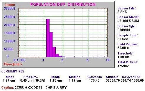 圖7:使用SPOS(AccuSizer 780)為氧化鈰#1中較大顆粒(直徑> 1.09μm)的異常“尾部”獲得的準(zhǔn)確PSD。 在60秒的分析過程中,確定大小的顆粒總數(shù)為475,982。