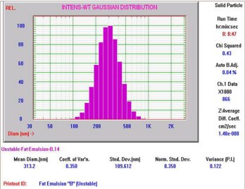 脂滴的大小是至關重要的,因為較大粒徑的乳粒(>5μm)可以被困在肺部,也是乳化液破壞穩定的一個指標。 USP<729>測試需要兩種分析技術:DLS,或激光衍射,以測量分布的均值和標準差,光阻法是用于檢測大于5μm的尾端大顆粒。 Nicomp 380激光粒度儀系列可用于測量平均尺寸,AccuSizer 780 顆粒計數器系列是測量大于5μm尾端大顆粒的首選方法。