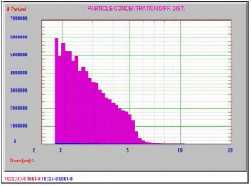 一個典型的方法二檢測案例:使用AccuSizer 780 顆粒計數器的檢測結果如圖5和圖6所示。 請注意大于0.5μm在不良結果中的占比是特別多的,詳見圖6。