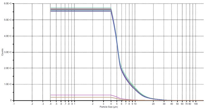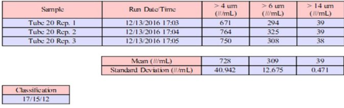 提供顆粒濃度和ISO 4406等級編號的自動報告將打印或發(fā)送到LIMS系統(tǒng)。生成報告的示例如圖5和6所示。圖5顯示了針對單個樣品管進行三次測量的標準ISO 4406報告。圖6中的數(shù)據(jù)顯示了將一個樣品分為四個樣品管的顆粒數(shù)與尺寸數(shù)據(jù)的關(guān)系,每個樣品管分析了三次。下方的兩條曲線顯示了瓶之間清理后的背景計數(shù)。