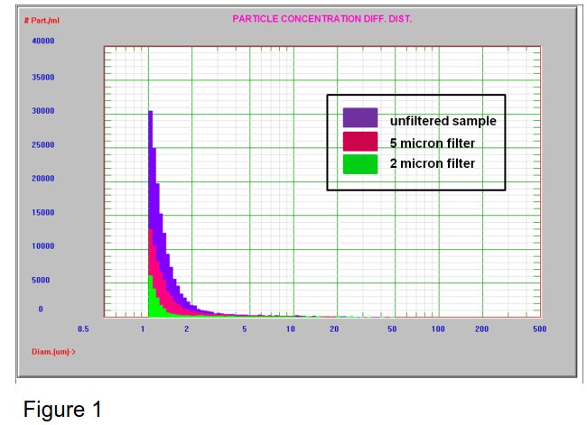 圖1顯示了用2微米和5微米過濾器過濾噴墨墨水的過濾測試結果。兩種過濾器都顯示出>1微米顆粒濃度的改善。未經過濾的樣品中含有大于1微米的10萬個顆粒/毫升,而5微米和2微米的樣品中分別含有約7萬個和約2萬個顆粒/毫升。AccuSizer 780能夠有效地檢測超大尺寸顆粒的數量。AccuSizer也可作為監測質量控制過程有效性的分析工具。