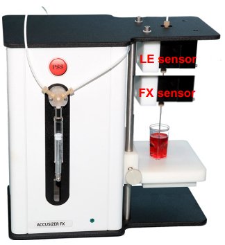 PSS Accusizer FX-Nano系統(如下所示)是設計在更小的顆粒尺寸和更高的濃度下工作。這是通過使用兩個傳感器完成的;FX-Nano傳感器測量范圍為0.15-0.6μm, LE400傳感器測量范圍為0.5-400μm。新的FX-Nano傳感器使用聚焦光束來減少檢測的總體積,從而提高了傳感器的濃度限制。該傳感器與SIS進樣器聯用,使進樣體積低至250μL。此配置通過了USP787治療性蛋白注射劑中的不溶性微粒。