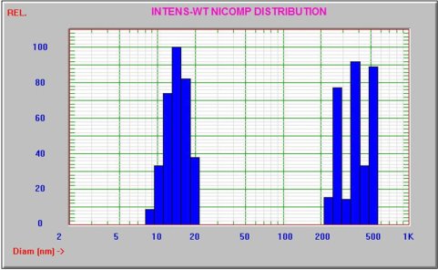 使用PSS的Nicomp 380動態光散射儀測試它,通過圖2,以評估單體的大小并大致了解聚集蛋白的大小。峰#1(天然蛋白):14.6nm,強度52%(總質量99.6%)。2號峰(聚集的尾巴):395nm,強度為48%(總質量的0.4%)。 AccuSizer FX-Nano被用于詳細研究聚集體在200-500 nm或更大尾端。