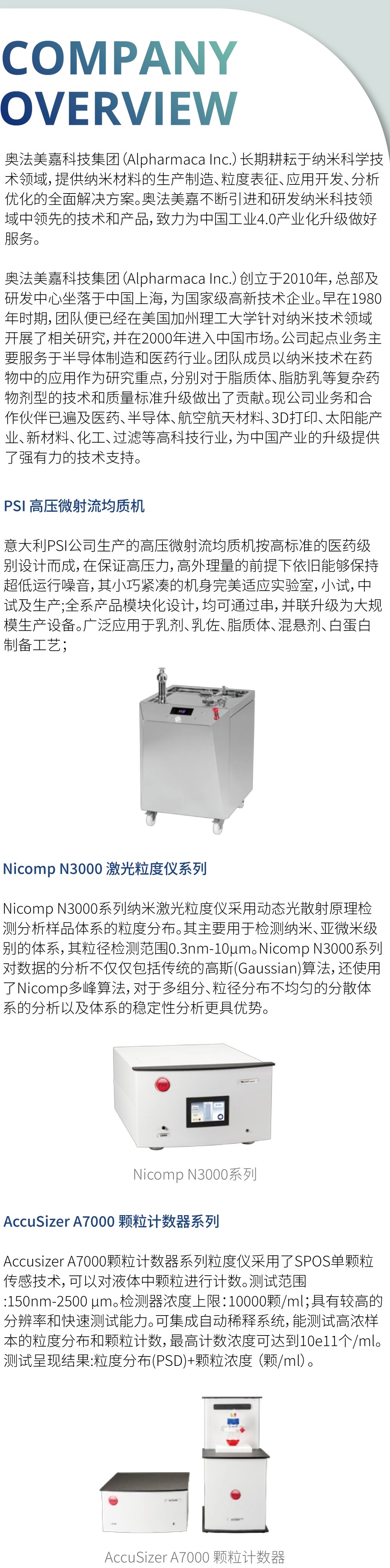 奧法美嘉(Alpharmaca)科技有限公司,立足于醫藥行業,耕耘于納米科學材料,化工,半導體,環境科學,汽車,過濾,涂料,墨水,油品等行業,以專業的納米微米檢測技術,“致力粒度分析,專注客戶體驗”。
