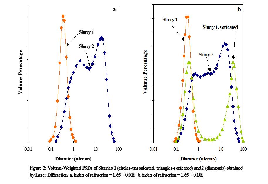 比較而言,slurry2的粒徑分布圖是寬得多的雙峰分布。在這個例子中,假設吸收系數的改變導致粒徑分布峰型發生顯著改變。然而,真正的問題在于實驗得出的結論:粒徑大于1μm的粒子的體積占總粒子體積的大部分(>70%)。這與前面討論的SPOS法所得到的結果 (粒徑大于1μm的粒子體積占所有粒子的不到1%) 相矛盾,而SPOS檢測結果又經過重量分析法驗證是準確的,因而說明圖2中的slurry2的分布是極不準確的。同時,圖2b也給出了slurry1經20s超聲后由激光衍射法檢測所得到的粒徑分布圖。超聲后主峰集中在0.3μm,這同slurry1相一致,然而還出現了一個以35μm為中心占總粒子體積50%的次級峰,這個結果顯然又是錯誤的。由SPOS得到的粒徑分布圖表明,超聲有助于減少尾部大粒子的總數,而不是象激光衍射法測定結果顯示的制造出大粒子。這些結果都證明了使用激光衍射法預測slurry質量存在著潛在的危險。