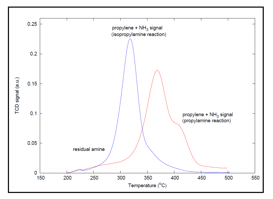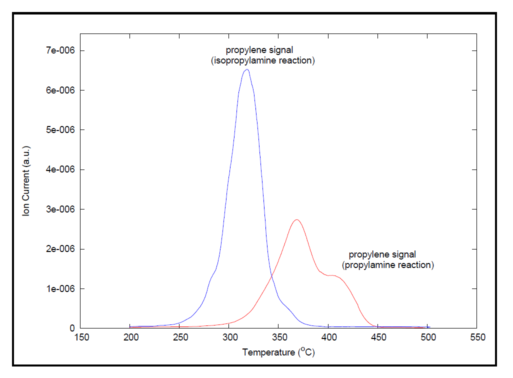 Y型分子篩活化后即進行脈沖化學吸附。在此步驟中,采用惰性氣體氦氣,通過流經一個5cm3的loop環向樣品中注入10次丙胺蒸汽,以確保樣品吸附飽和。分析的最后一步是程序升溫脫附(TPD)。在這一步中,質譜儀開始掃描檢測產物丙烯信號。數據是在200°C到500°C的程序升溫期間采集得到。