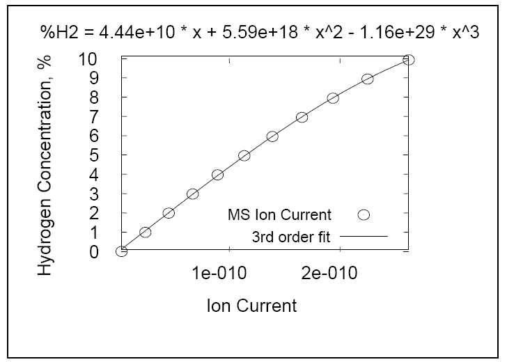 接著質(zhì)譜數(shù)據(jù)可導(dǎo)出為ASCII文件,利用幾種商業(yè)化的軟件包(Microsoft Excel, Microcal Origin, andMatlab from Mathworks)可繪制最終的校準(zhǔn)曲線,如圖2所示。利用TCD校準(zhǔn)所計(jì)算出的氫氣濃度關(guān)系式,可獲得質(zhì)譜離子電流與氫氣濃度的關(guān)系,從而實(shí)現(xiàn)質(zhì)譜的氫氣校準(zhǔn)。目前市面上的大部分商用質(zhì)譜儀都可與AutoChem連用,以生成質(zhì)譜的校準(zhǔn)曲線。