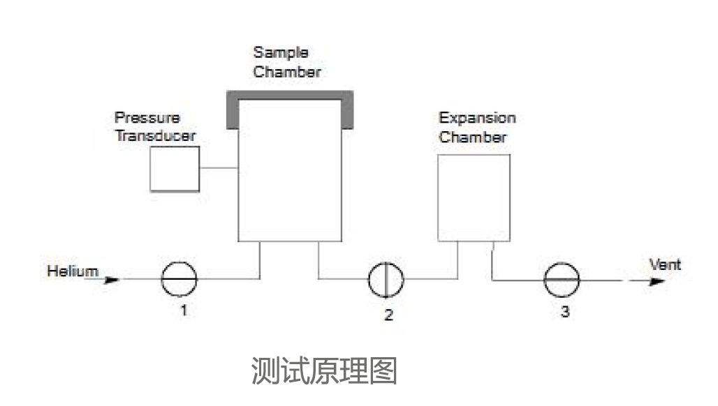 下圖是儀器的工作原理圖,樣品在樣品倉中形成密封環境,打開 1 閥,氣體進入樣品倉,達到一定壓力后,閥門關閉,待樣品與氣體達到平衡后,壓力傳感器讀取此時壓力 P1 。之后 2 閥打開,氣體則會從樣品倉擴散進入擴展倉,待兩個倉內的氣體和樣品達到平衡后,壓力傳感器讀取此時壓力 P2 。之后基于理想氣體狀態方程 PV=nRT,換算出材料的真實體積 V ,帶入 p=m/V,計算出材料的真實密度。