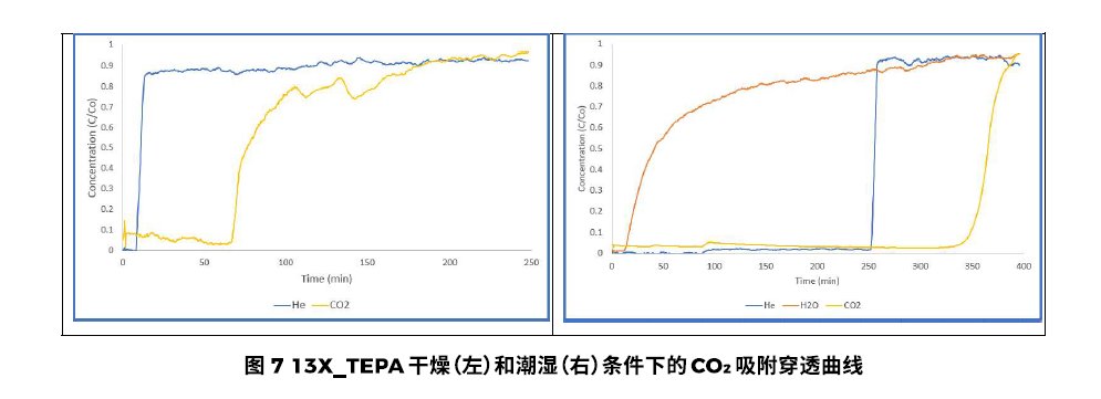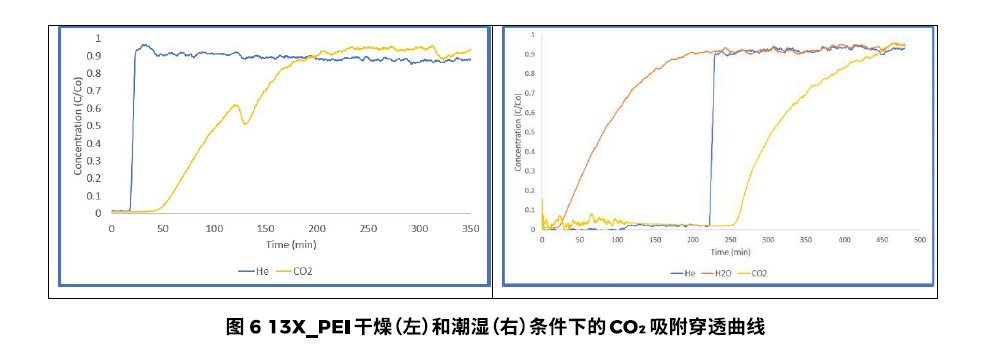 同樣地,在潮濕和干燥條件下,對這6種材料進行CO2穿透實驗。實驗中因CO2濃度較低(400 ppm)導致穿透時間較長以及CO2的絕對吸附量較低。我們可以看到在干燥條件下實驗過程中混氣閥打開后20min左右或者潮濕條件下樣品吸附水飽和后20min左右He作為標定氣體快速地完成穿透。這里在CO2穿透實驗之前,先通入水蒸汽讓樣品吸附飽和是為了更好地評估CO2與水之間的競爭吸附行為。本文的結論部分中表2總結了這6種材料在不同實驗條件下的CO2吸附量。