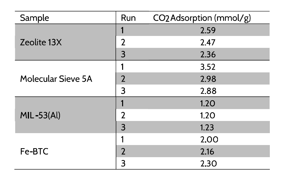 本實驗采用Micromeritics 穿透曲線分析儀BTA研究了一系列吸附CO2的吸附劑,從對CO2無親和力的材料到對CO2具有強吸附力的材料,包括MIL-53(Al),Fe-BTC,沸石13X 和5A分子篩。表1中列出了每種材料的CO2吸附量。其中,5A分子篩表現出最強的CO2吸附能力,重復實驗的穿透曲線指出5A分子篩需要更高的脫氣溫度才能再生。而其他三類材料,沸石13X,MIL-53(Al)和Fe-BTC則在30°C脫氣溫度下均表現出良好的CO2循環吸附性能。