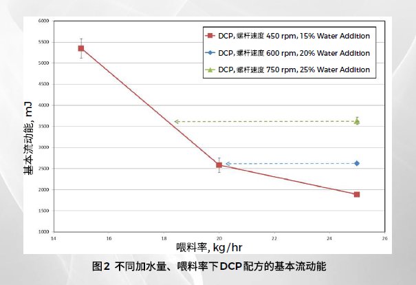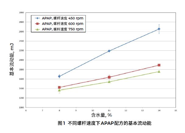 從 APAP 配方的數(shù)據(jù)圖(圖1)可以看出,在固定的給料速度下,對于所有的螺桿速度,基本流動(dòng)能(BFE)隨著水含量的升高而升高。