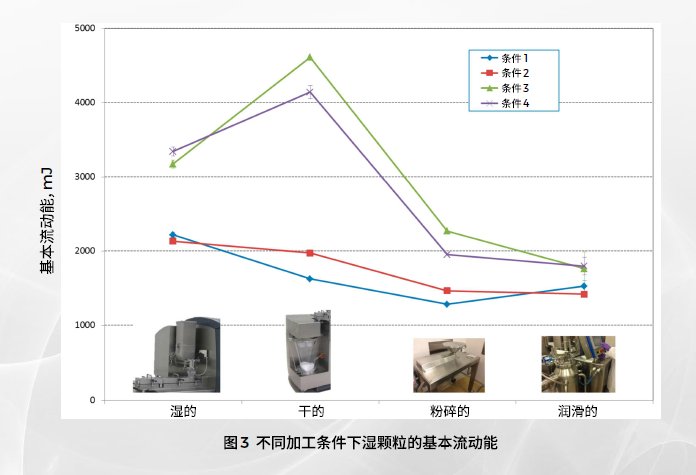 由表 1 所示,選用了幾種不同的加工“條件”組合,造出兩種不同性質(zhì)的濕粒。經(jīng)測試,在 1&2 條件下,濕粒的 BFE 數(shù)值大概為2200mJ 左右, 3&4 條件下為3200mJ。在整個(gè)濕法造粒加工過程的后續(xù)流程中,BFE 數(shù)值的這一相對分組情況保持不變,3&4 條件下的 BFE 數(shù)值總是高于 1&2 條件(圖3)。