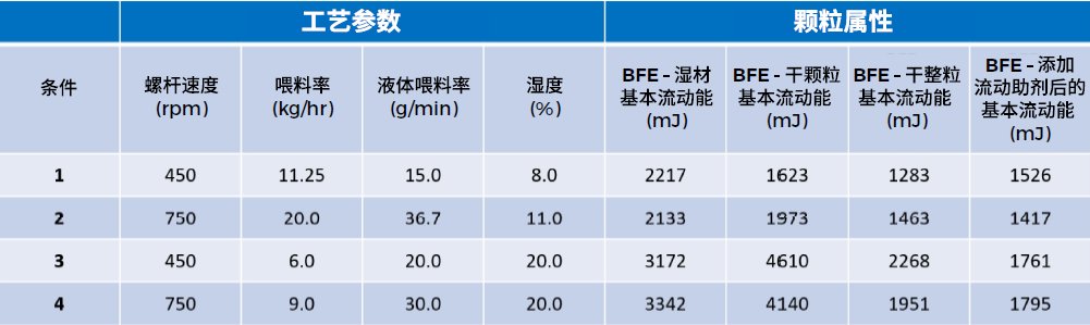 鑒于兩種不同的基材都具備同樣的規(guī)律,因此,能夠認(rèn)為使用不同的水含量、螺桿轉(zhuǎn)速和供料速度等多個(gè)參數(shù)組合,獲得指定的濕粒性質(zhì)(用 BFE 數(shù)值描述)。
