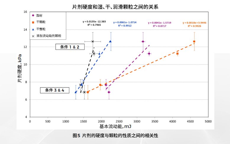 四個(gè)條件下生產(chǎn)的片劑的硬度與干燥顆粒以及磨粉后顆粒的 BFE 數(shù)值間有極好線性相關(guān)性,R2 數(shù)值高0.99(圖5)。與濕粒和潤滑顆粒間的線性相關(guān)性稍差,這是由于存在水分或流動(dòng)助劑(硬脂酸鎂)等額外成分的影響。眾所周知,這兩者即便是含量很少,也會(huì)對粉體的流動(dòng)性質(zhì)產(chǎn)生影響。