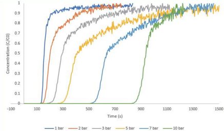 圖7是采用 Micromeritics Breakthrough Analyzer(BTA)穿透曲線分析儀收集商用 13X 型分子篩在30℃@(1-10 bar)下對單組分 50% CO2(bal.N2)流動氣體的穿透曲線。BTA 穿透曲線分析儀是一款外形緊湊、性能出色的多功能選擇性吸附儀,配置靈活的氣體或蒸汽輸送和管理系統,可模擬工藝相關條件下收集分子篩對單組分和多組分氣體或蒸汽的瞬態和平衡吸附數據。圖 7 數據結果表明在 1-10 bar 測試壓力范圍內 13X 分子篩均是非常有效的二氧化碳吸附劑,且其二氧化碳吸附量隨著壓力升高而增大。例如,10 bar 下13X 可吸附 15 mmol/g 二氧化碳。
