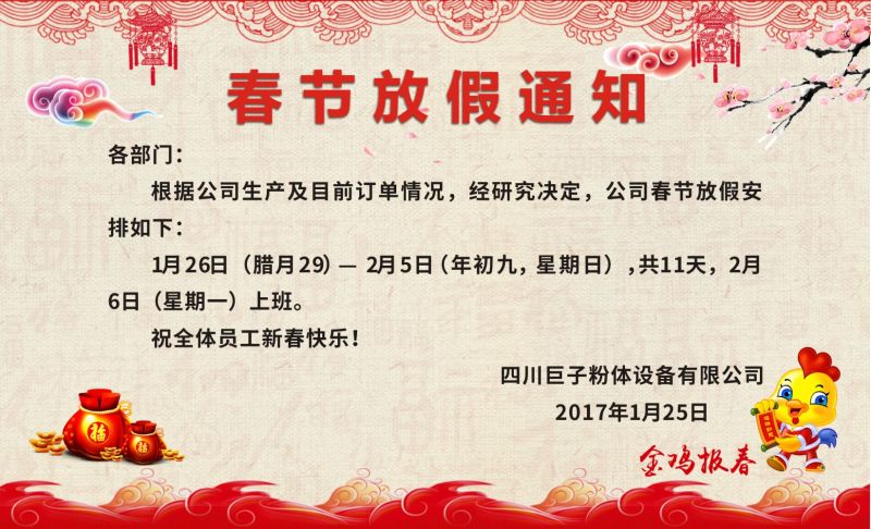 2017年春節將至,為了方便新老客戶聯系公司了解產品,特別在此公告:四川巨子于1月26日至2月5日放假,2月6日上班。若給您帶來不便我們感到十分抱歉,盡請諒解。最后,四川巨子全體員工祝您和您的家人新年快樂,闔家幸福!