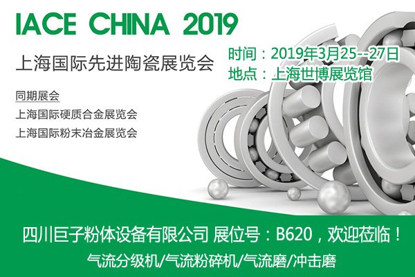 IACE CHINA 2019第十二屆上海國(guó)際先進(jìn)陶瓷展覽會(huì)暨會(huì)議3月25~27日在上海世博展覽館舉行。展會(huì)吸引了來(lái)自20個(gè)國(guó)家、地區(qū)的400多家優(yōu)秀企業(yè)參展,展覽面積超過25,000平方米。第十二屆上海國(guó)際粉末冶金展覽會(huì)暨會(huì)議、第十二屆上海國(guó)際硬質(zhì)合金展覽會(huì)暨會(huì)議也將同期舉行。四川巨子粉體設(shè)備有限公司作為超微粉體設(shè)備制造商應(yīng)邀參加,陶瓷色料粉碎機(jī)等產(chǎn)品屆時(shí)亮相。