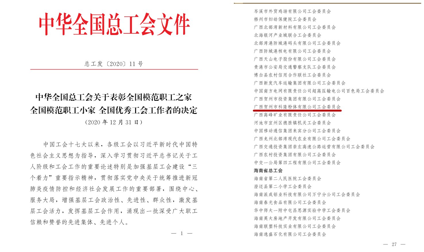廣西賀州市科隆粉體有限公司工會委員會獲中華全國總工會表彰