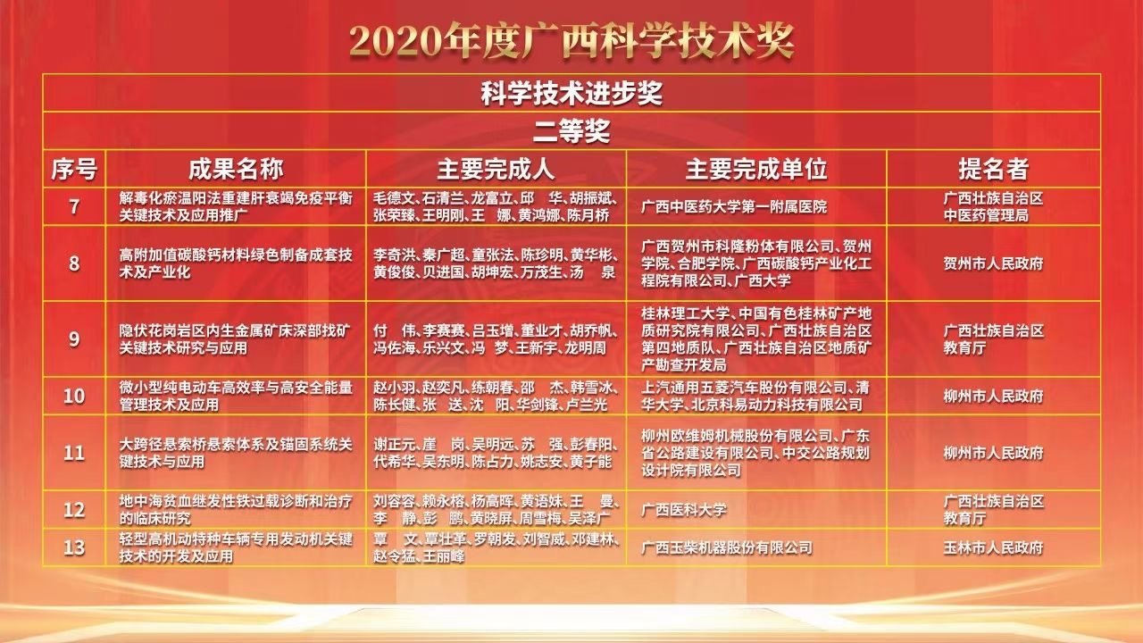 2021年7月30日,廣西科學技術獎勵大會在邕舉行,會議表彰了2020年度獲得廣西科學技術獎、廣西“金繡球友誼獎”的科技人員。