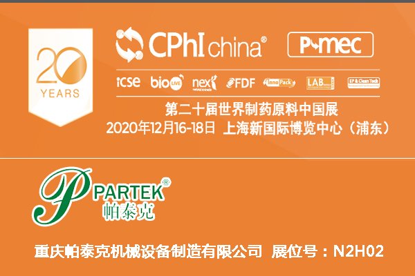 12月16-18日,"第二十屆世界制藥原料中國展"(CPhI China 2020)將攜手“第十五屆世界制藥機械、包裝設備與材料中國展”(P-MEC China)在上海新國際博覽中心耀世綻放,重慶帕泰克機械設備制造有限公司攜粉體工程、制劑設備在N2H02展位等您!