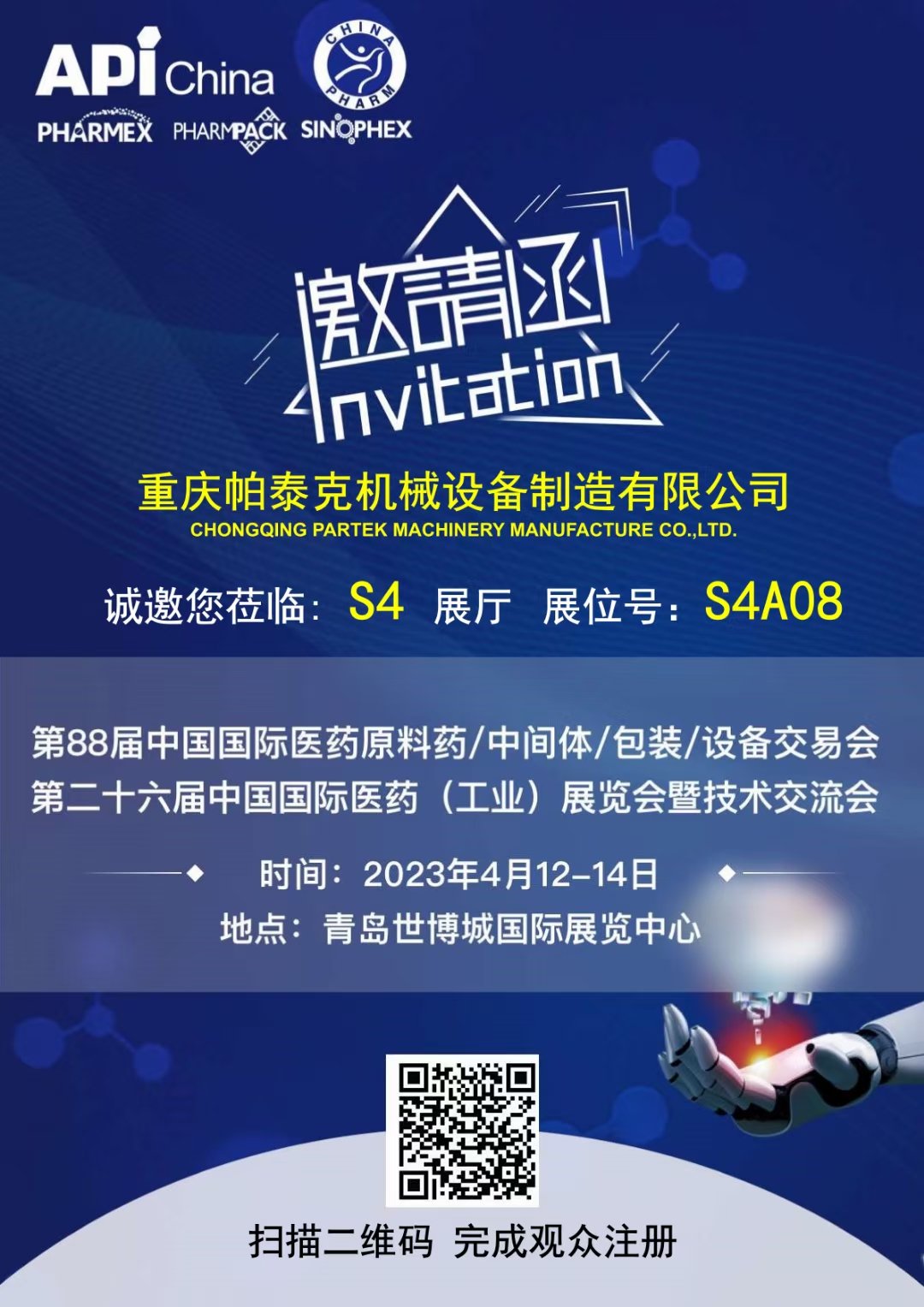 API China第88屆中國國際醫藥原料藥/中間體/包裝/設備交易會定于2023年4月12-14日,在山東.青島舉行。制劑,粉體工程專家--重慶帕泰克機械將盛裝亮相。