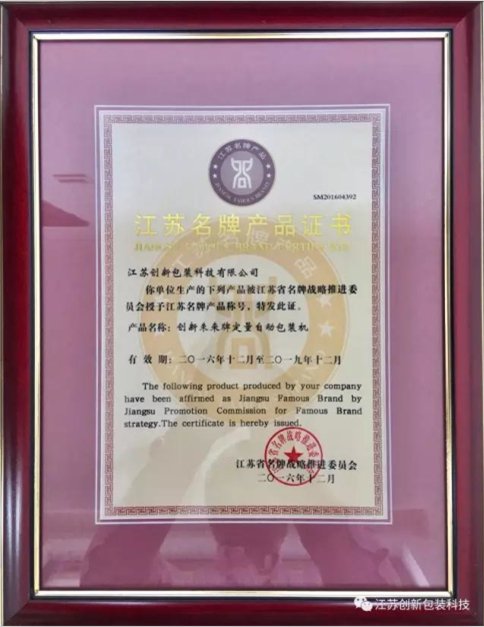 江蘇創(chuàng)新包裝科技有限公司研發(fā)的“創(chuàng)新未來”牌定量自動包裝機獲江蘇省名牌產(chǎn)品稱號,其產(chǎn)品包括閥口自動計量灌裝機、敞口自動計量灌裝和自動縫口機、噸袋自動計量灌裝機及自動上袋、自動封口、自動纏膜等相配套的包裝設(shè)備。