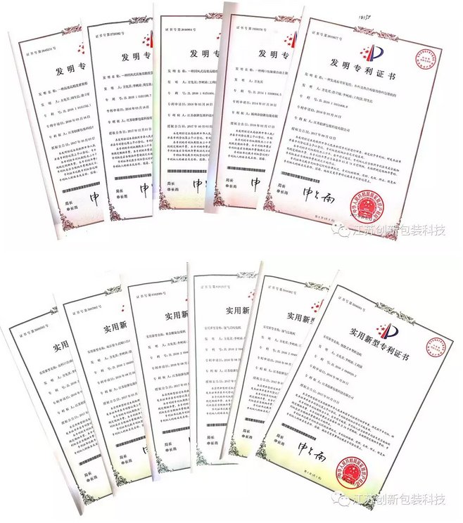江蘇創新包裝科技有限公司2017年度獲得4項發明專利和6項實用型專利,使公司共擁有發明專利5項、實用型專利21項。這些專利的取得是公司重視科技研發、公司科技人員勤奮工作的結果。這些專利技術正逐步應用到產品中,使我公司智能包裝碼垛線、定量自動包裝機有更高的科技含量,不斷提高了公司產品的品質,受到了政府的獎勵、同行的肯定、客戶的歡迎。