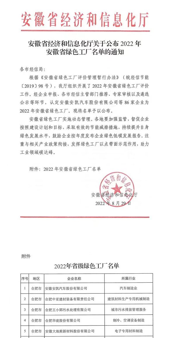 8月29日,安徽省經濟和信息化廳發(fā)布了2022年安徽省綠色工廠名單,公司通過認定,標志著我司智能生產制造邁上了新臺階,實現了新突破。