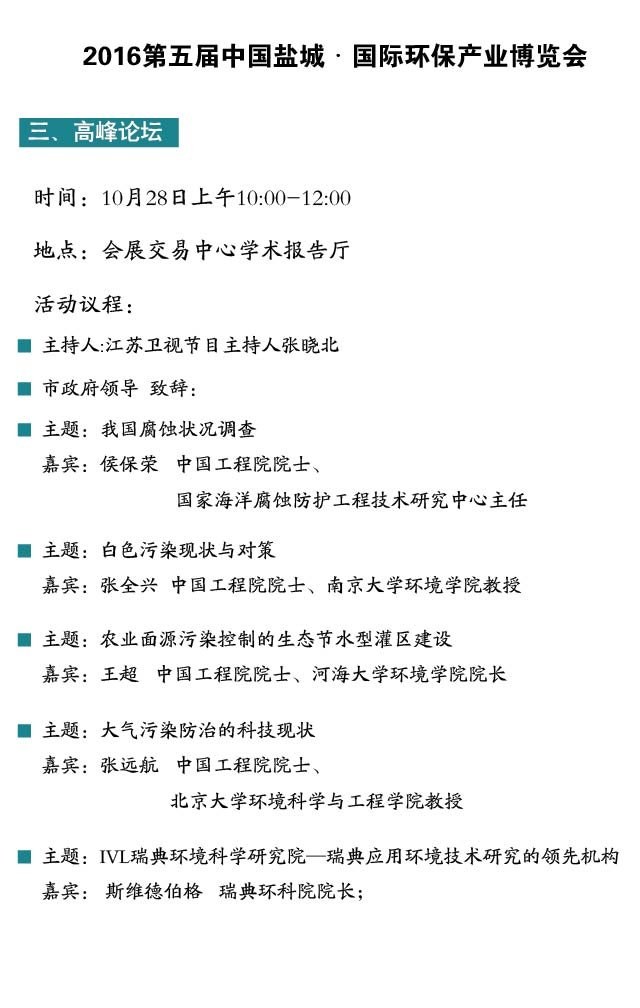 2016第五屆中國鹽城國際環保產業博覽會于10月28日-30日在江蘇鹽城舉行。龍頭企業齊聚,金秋十月、共創輝煌!本次展會除品牌展區外,將按環保技術應用領域劃分三大特色展區:市政環境治理展區,工業環境治理展區,農村環境治理展區。