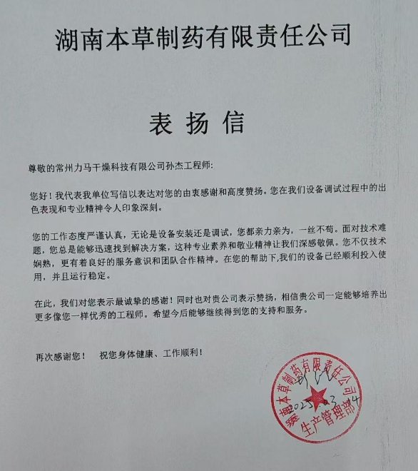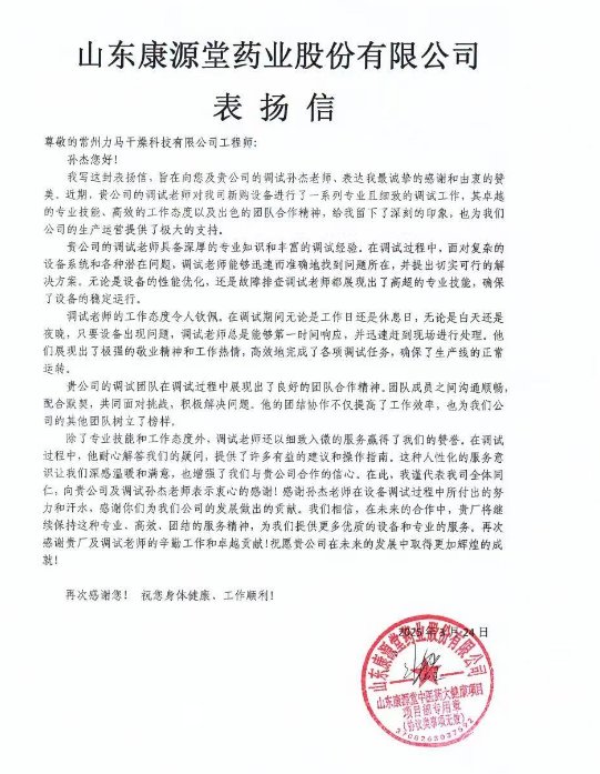 近日,[常州力馬]收到來自[山東康源堂藥業(yè)]和[湖南本草制藥]的表揚信。信中,[山東康源堂藥業(yè)]和[湖南本草制藥]對[常州力馬工程師孫杰]在[設(shè)備的調(diào)試工作]中展現(xiàn)的專業(yè)能力、高效服務(wù)與團隊協(xié)作精神給予高度贊譽,用大篇幅誠意贊譽公司的服務(wù)人員。這不僅是客戶本公司的高水平管理及獎懲分明的體現(xiàn),也是對力馬公司的深度認可,更是公司在行業(yè)內(nèi)持續(xù)深耕的社會見證。