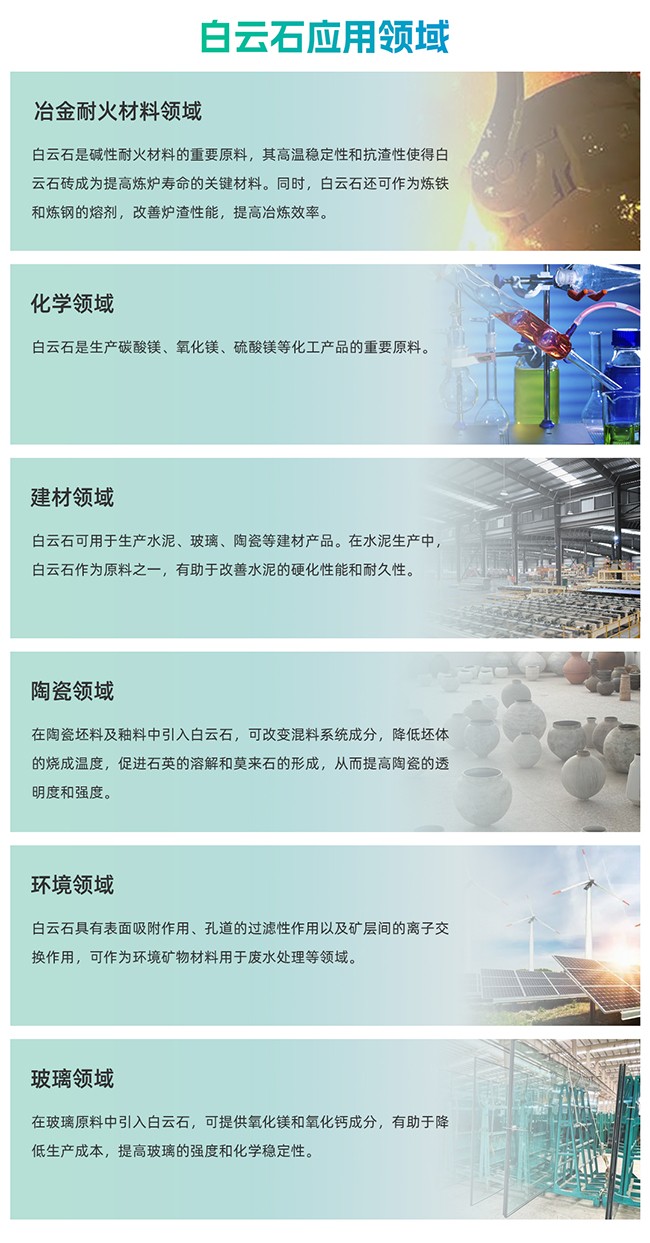白云石憑借其獨特的物理化學性質、豐富的資源儲量以及多樣的加工方式,在環保、耐火材料、陶瓷、等多個領域展現出廣泛應用前景。