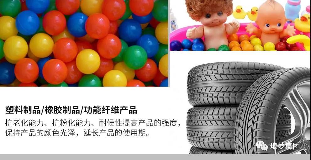 用于塑料、橡膠和功能纖維產品中,它能提高產品的抗老化能力、抗粉化能力、耐候性同時可以提高產品的強度,保持產品的顏色光澤,延長產品的使用期。
