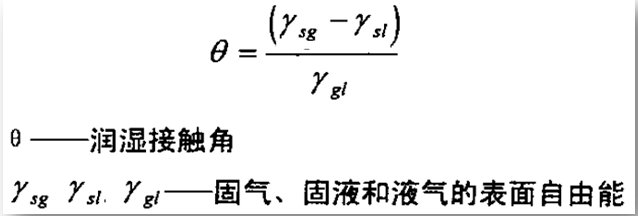 粉體顆粒被液體浸濕的過程實際上就是液體和氣體之間爭奪粉體表面的過程。這關鍵取決于粉體表面與液體的極性差異。粉體顆粒被液體浸濕的過程主要是顆粒表面的潤濕性。浸濕性能通常用潤濕接觸角θ來度量。潤濕接觸角θ的表達式如下所示: