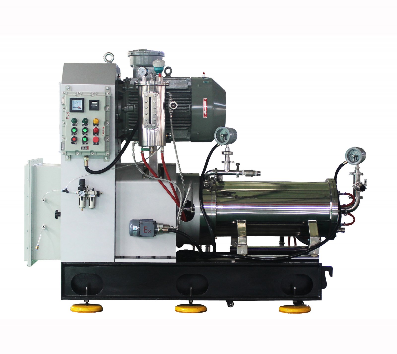 該產品具有緊湊、穩定的焊接結構機架,實用而美觀。精心設計的盤棒結合分散機構,使研磨介質與物料在分散器之間進行強烈的能量交換,從而達到對物料的超精細研磨。先進的大流量分離篩結構,保證高效生產,不發生堵塞。集成式雙端面機械密封,可根據物料特性選擇潤滑劑。