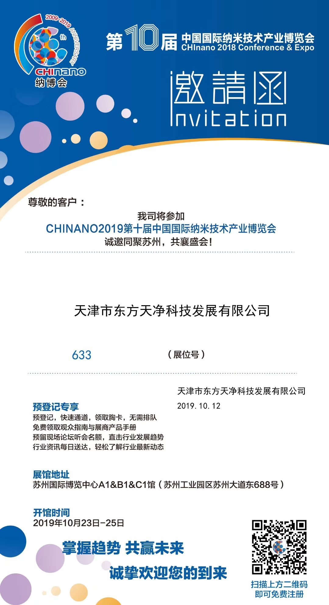 第十屆中國國際納米技術產業博覽會(The 10thCHInano Conference & Expo----CHInano 2019)將于2019年10月23-25日在蘇州國際博覽中心隆重舉辦。天津市東方天凈科技發展有限公司誠邀同聚蘇州,共襄盛會!