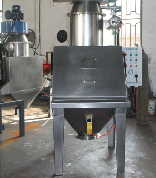 目前在粉粒料大批量生產過程中,為了拆包儲存運輸方便,大家都趨向把小袋包裝的物料拆開放在一個容器中集中儲存和使用。現有結構是采用把拆好包的物料投到小料倉內儲存,在小料倉上方安裝除塵收集器,這樣導致操作不方便,現場灰塵多,物料回收困難,容易污染,廢棄物料多。