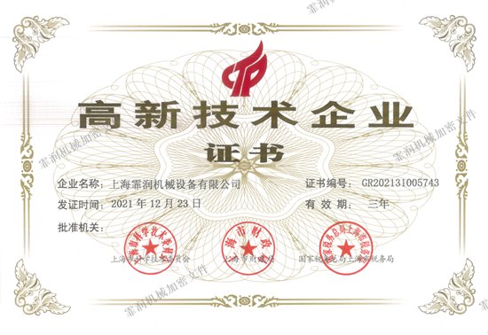 近日,我司上海霏潤機械設備有限公司收到了由科學技術委員會、財政局和稅務總局組織的高新技術企業認定復審通過后頒發的高新技術企業證書。
