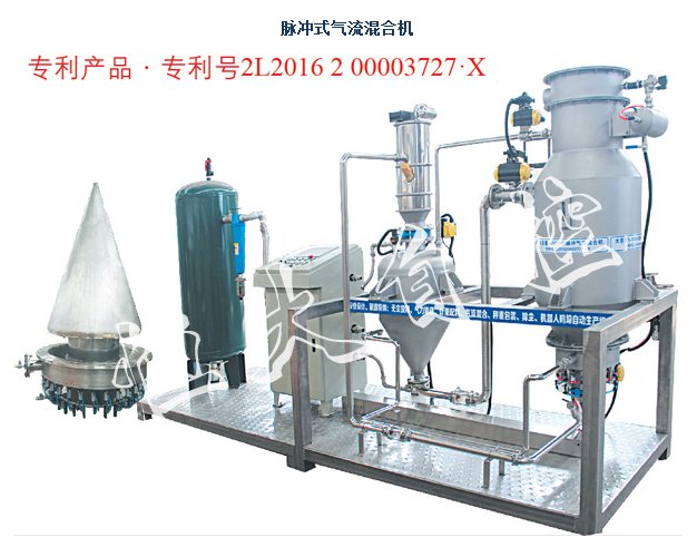 該混合機(jī)是將壓縮空氣經(jīng)混合頭上的噴嘴送入混合腔體內(nèi),物料瞬間隨壓縮空氣沿筒壁螺旋式上升,形成流態(tài)化混合狀態(tài),經(jīng)過(guò)若干個(gè)脈沖吹氣和停頓間隔,即可實(shí)現(xiàn)全容積內(nèi)物料的快速均勻混合。
