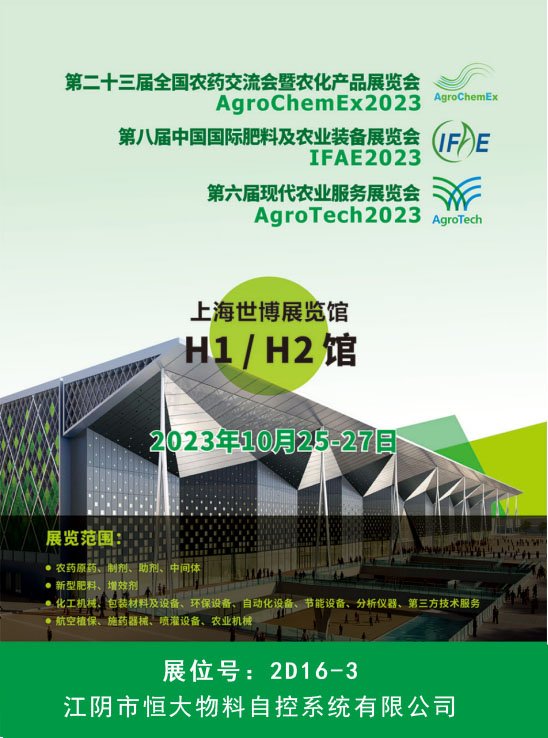 由中國農藥工業協會主辦的“第二十三屆全國農藥交流會暨2023國際農化產品展覽會”將于2023年10月24~27日在上海浦東喜來登由由酒店和上海世博展覽館舉行。江陰市恒大物料自控系統有限公司作為粉體自控解決方案供應商將攜多款產品亮相。